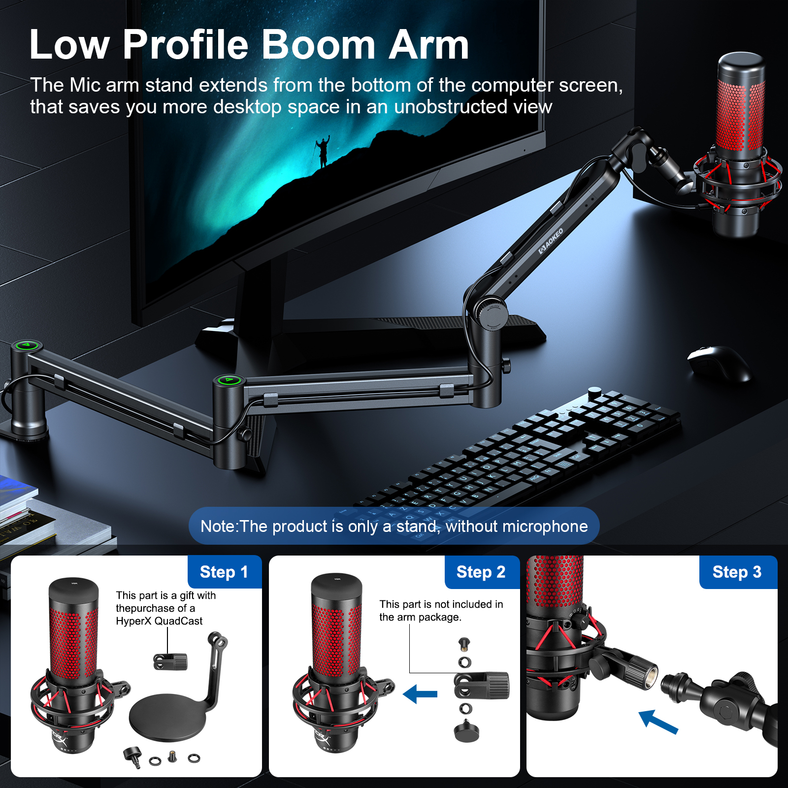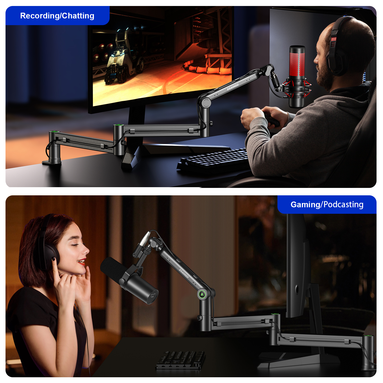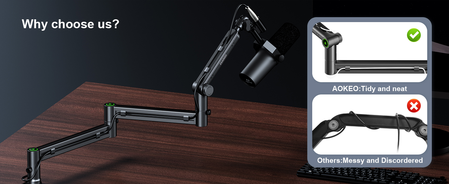 Saving your desk space with Aokeo boom arm. Get smooth, silent adjustments for a clean, professional look. Compatible with Blue Yeti, HyperX, and more.